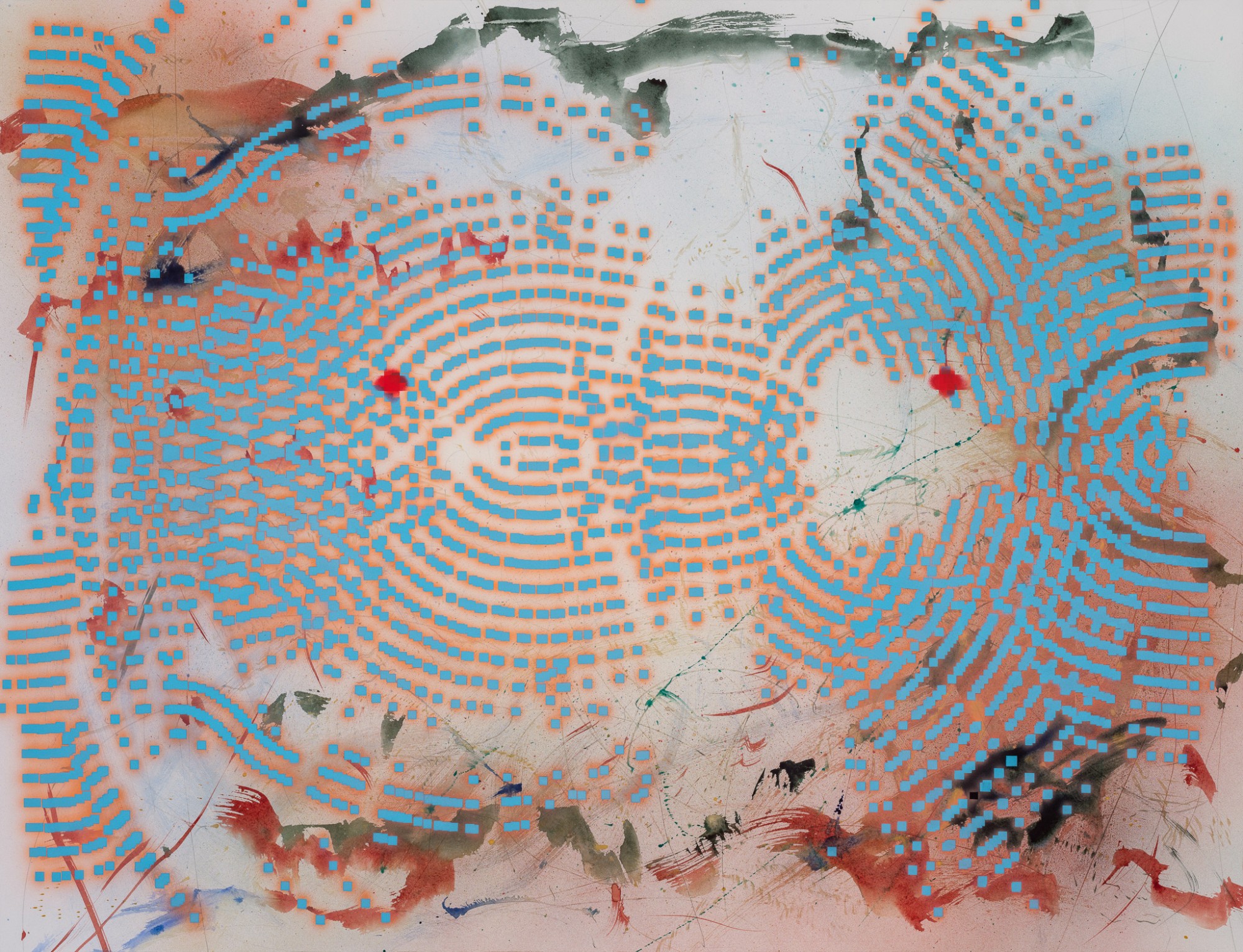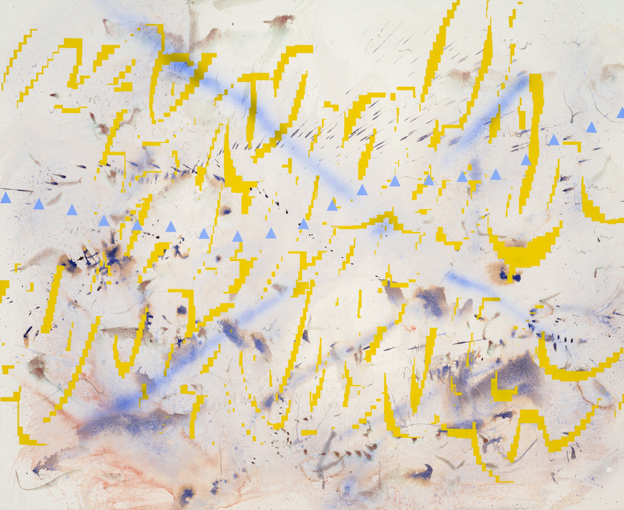 바탕에 칠한 수채물감은 안료의 무게 차이로 인해 마르면서 색이 분리되는 물감으로, 처음엔 짙푸른 색이었다가 울트라마린 블루와 번트 시엔나가 분리되어 나타난다. 바탕 사진을 아이패드로 불러와 패턴을 만들었고, 완성한 패턴은 레이저 커팅한 시트지로 마스킹했다. 시트지는 접착력이 너무 강하기 때문에 종이에 붙이기 전에 파우더를 묻히는 작업을 거쳐야 한다. 마스킹은 접착력의 정도와 종이의 컨디션, 칠할 영역의 물감 두께를 고려해서 방식을 선택한다. 노란색 패턴은 아크릴릭 과슈, 푸른색 삼각형은 아크릴릭을 사용했다. 그 둘은 피막의 표면 광택이 달라서 화면 속 역할도 다르다. image(143)은 크기에 비해 단시간에 완성했다. 계속 붙들고 만지다 보면 이미지가 눈에 익어서 낯선 거리를 유지하기 어려우므로 오래 끌지 않는 게 좋다.