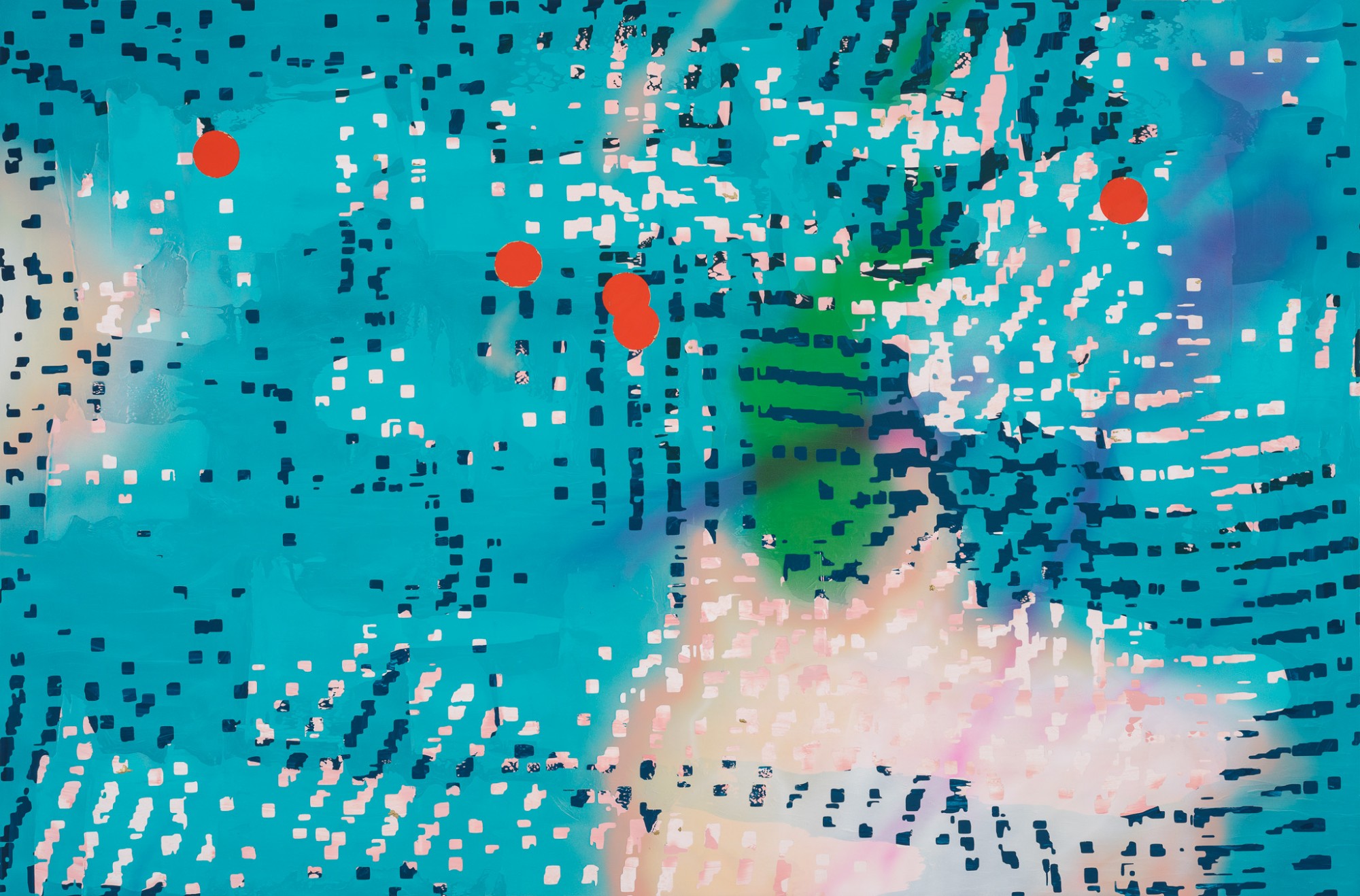 스트라스모어 브리스톨 롤을 펼쳐서 아크릴 물감을 스퀴즈로 밀어 바르는 것부터 시작했다. 물감은 약간의 힘조절 차이로 투명하거나 불투명했고 자잘한 자국을 남기거나 날카로운 가장자리가 되었다. 사진을 찍어서 아이패드로 옮겨와 여러 경우의 수를 만들면서 바탕을 짙은 녹색으로 정했다. 사각형이 나열된 패턴 레이어는 여러 종류를 합치거나 빼면서 규칙을 읽을 수 없게 만들었고 레이저 커팅을 위해 벡터화하면서 모서리가 깎여나가 지금의 모양이 되었다. 에메랄드에 가까웠던 스케치보다 실제로는 터콰이즈 블루에 가깝다. 그 위에 둥근 브러시로 다섯 개의 붉은 점을 찍었지만 실제로는 충분히 큰 세 개의 동그라미와 하나의 땅콩 모양이며, 가장자리가 찢어진 부분은 킨츠기로 수리했다.